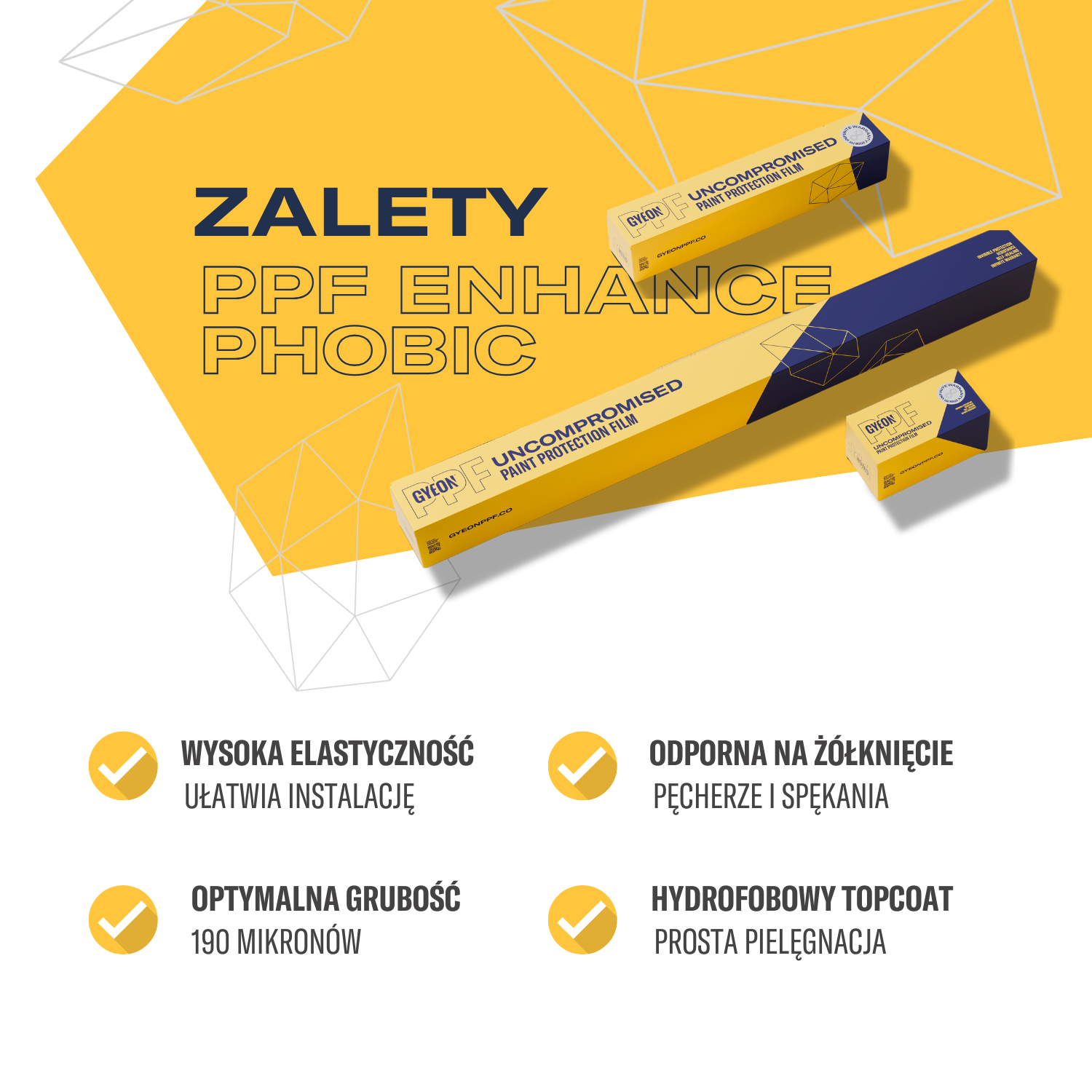 Enhance Phobic to nasza odpowiedź na rynki, które wymagają wysokiej jakości TPU i wysokiej jakości produktu typu „wszystko w jednym” o właściwościach hydrofobowych. Enhance Phobic oferuje tę samą łatwość montażu, jakość kleju i TPU co Enhance, ale jest wyposażony w dodatkową, hydrofobową powłokę nawierzchniową.
