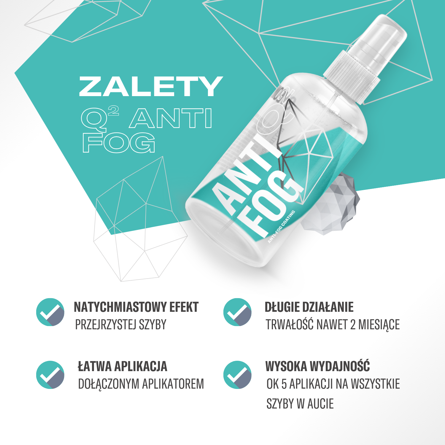 Zaparowane szyby są denerwujące i mogą być niebezpieczne. Q² AntiFog szybko i łatwo rozwiązuje ten problem, sprawiając, że szyby będą znów klarowne i zapewnią i idealną widoczność. Kondensacja pary jest zwykle spowodowana wilgocią w aucie lub dużą różnicą temperatur między wnętrzem a otoczeniem. Q² AntiFog eliminuje te problemy w jednej aplikacji, która zabezpieczy szkło przed parowaniem na przynajmniej 2 miesiące.