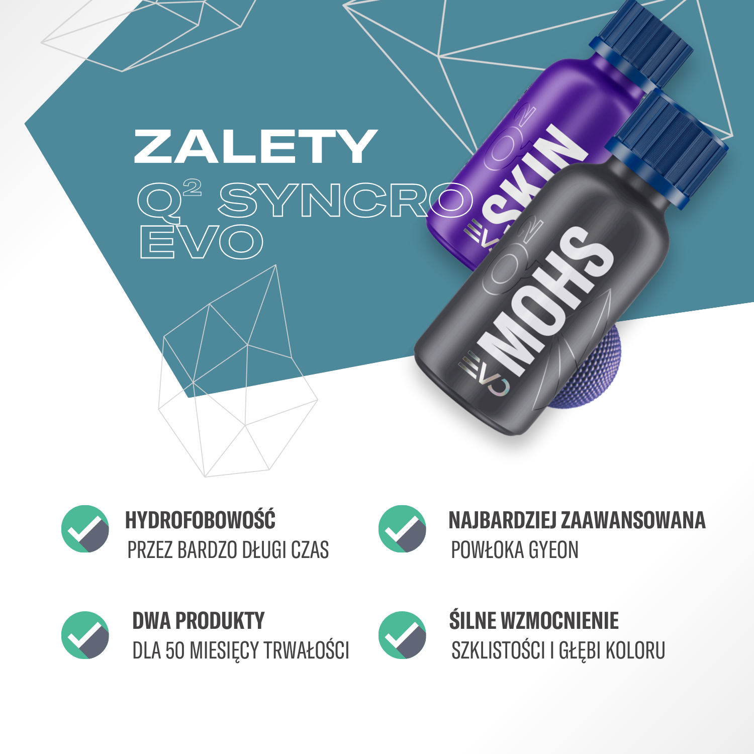 Q² Syncro EVO to niepowtarzalna okazja do nałożenia specjalnie zaprojektowanego systemu powłok składającego się z wyrafinowanego podkładu Q² Mohs EVO oraz warstwy wierzchniej Q² Skin EVO, która znacząco zwiększa połysk i trwałość efektu hydrofobowego. Warstwa wierzchnia zapewnia również bardzo silne wzmocnienie koloru, łatwo zauważalne na ciemnych lakierach.