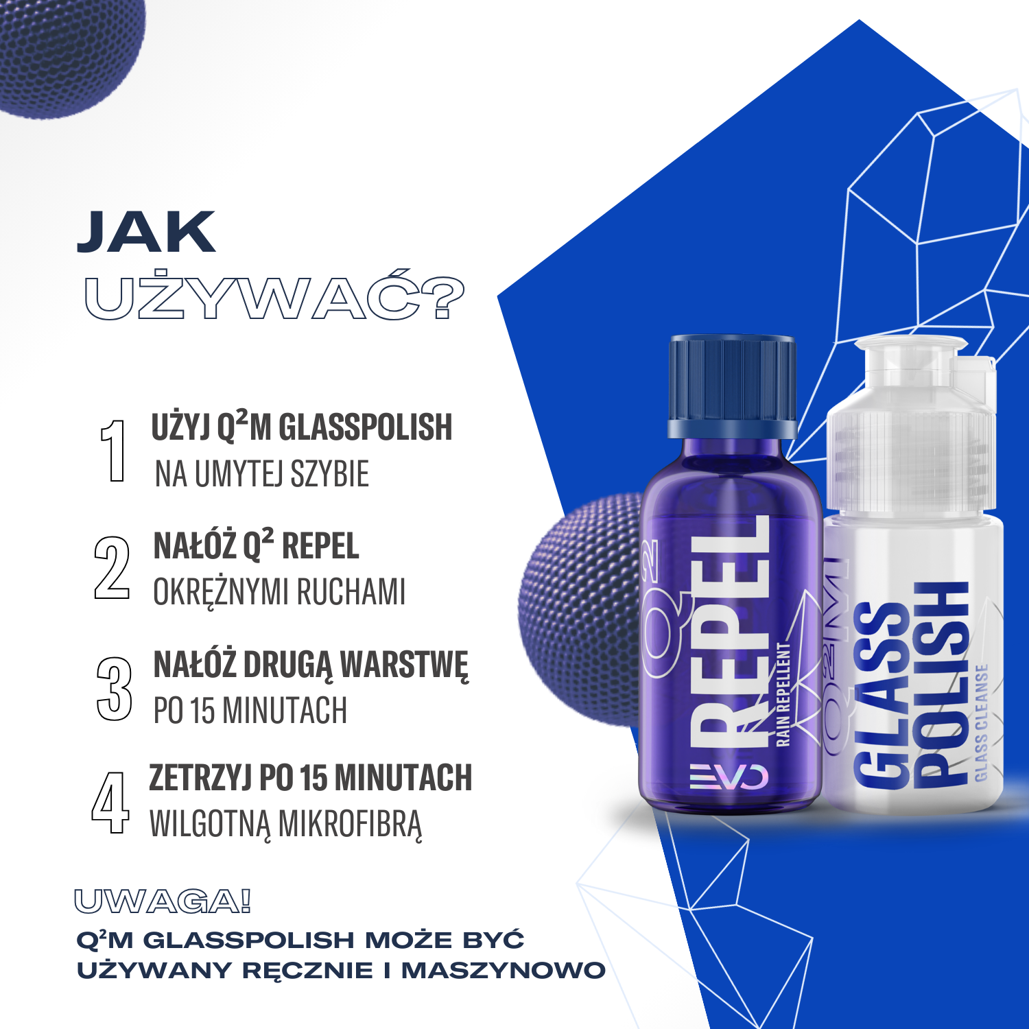 OPAKOWANIE ZAWIERA: Q² REPEL 20ML / Q²M GLASS POLISH 20ML / ZESTAW DO APLIKACJI / INSTRUKCJA