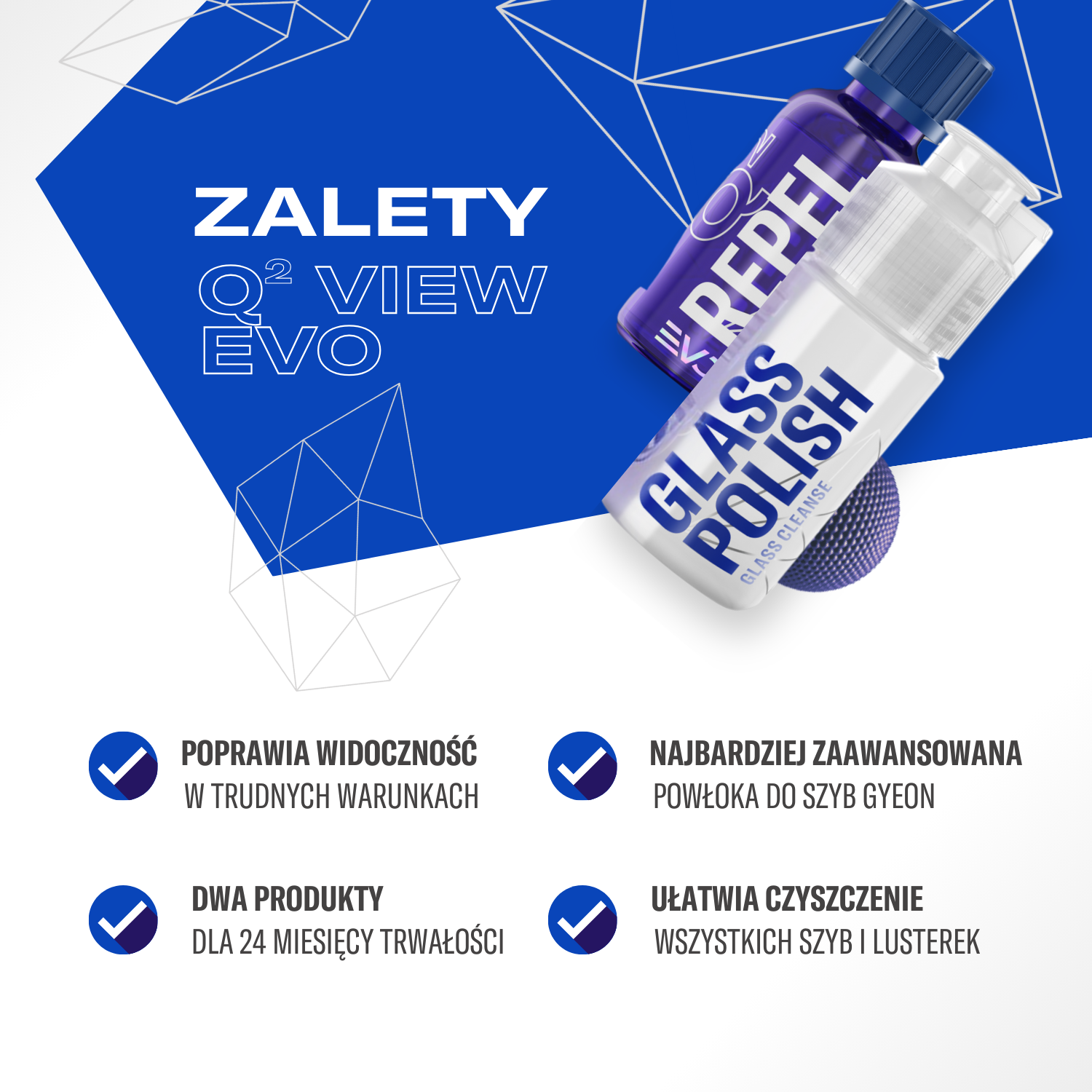 Q² View stanowi punkt odniesienia w branży w zakresie powłok do szyb. Jej trwałość sprawiła, że jest to rozwiązanie dla zaawansowanych entuzjastów detalingu i profesjonalistów. Q² View EVO kontynuuje tę tradycję, oferując jeszcze łatwiejszą aplikację dzięki Q²M GlassPolish. Co więcej, zapewnia jeszcze większą trwałość i odporność. Na najbardziej narażonej na czynniki zewnętrzne szybie czołowej powłoka działa około 24 miesięcy, podczas których oferuje rewelacyjne odpychanie wody. Użyta na bocznych szybach spokojnie osiąga 36 miesięcy.