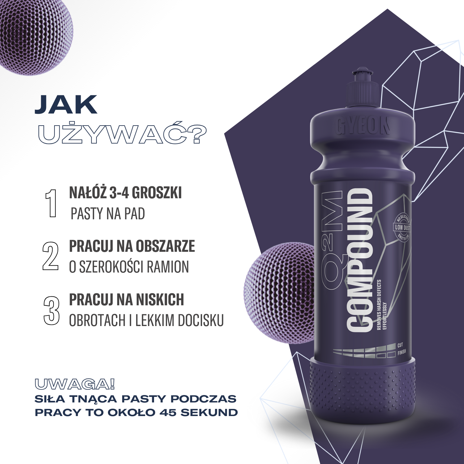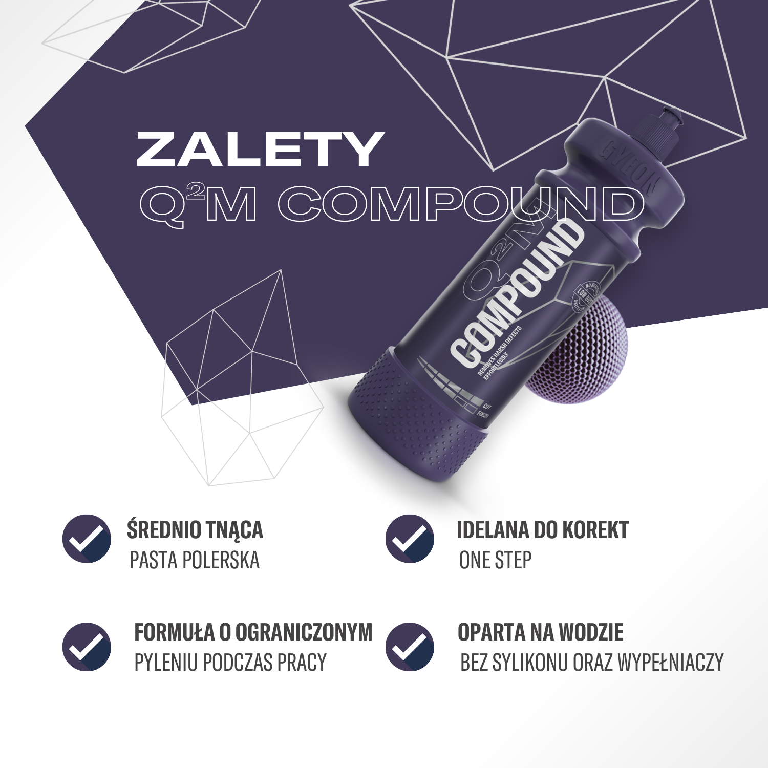 "Q²M Compound to pasta tnąca, zapewniająca świetne parametry i wysoki poziom usuwania rys przy bardzo niskim pyleniu i nieporównanie dobrym wykończeniu. Dobra technika pracy w połączeniu z orbitalną polerką pozwalają używać Q²M Compound do jednoetapowych korekt lakieru!