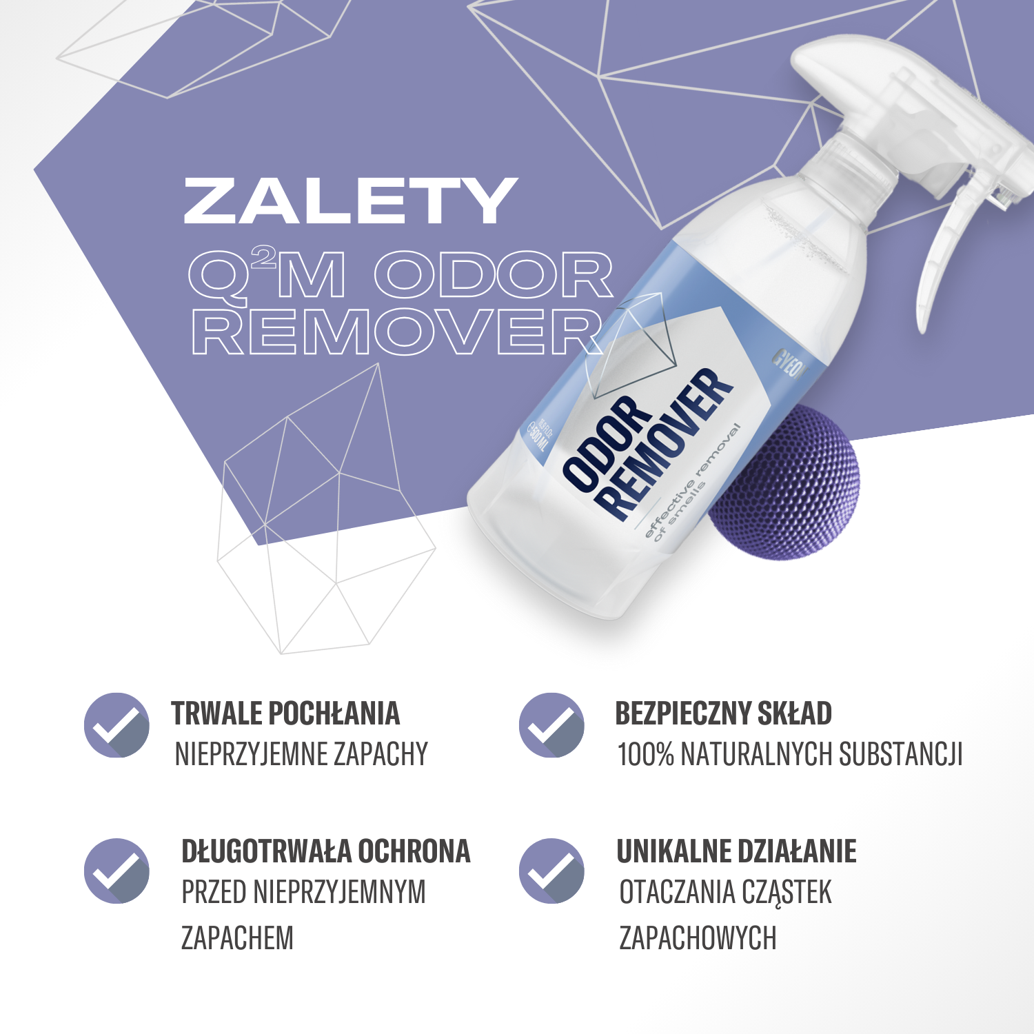 Q²M OdorRemover wykorzystuje unikalną technologię, aby trwale wchłonąć i usunąć nieprzyjemne zapachy z dowolnego wnętrza. Niezależnie od tego, czy jest to samochód, jacht, samolot czy dom, jego moc usunie zapach na wiele miesięcy.