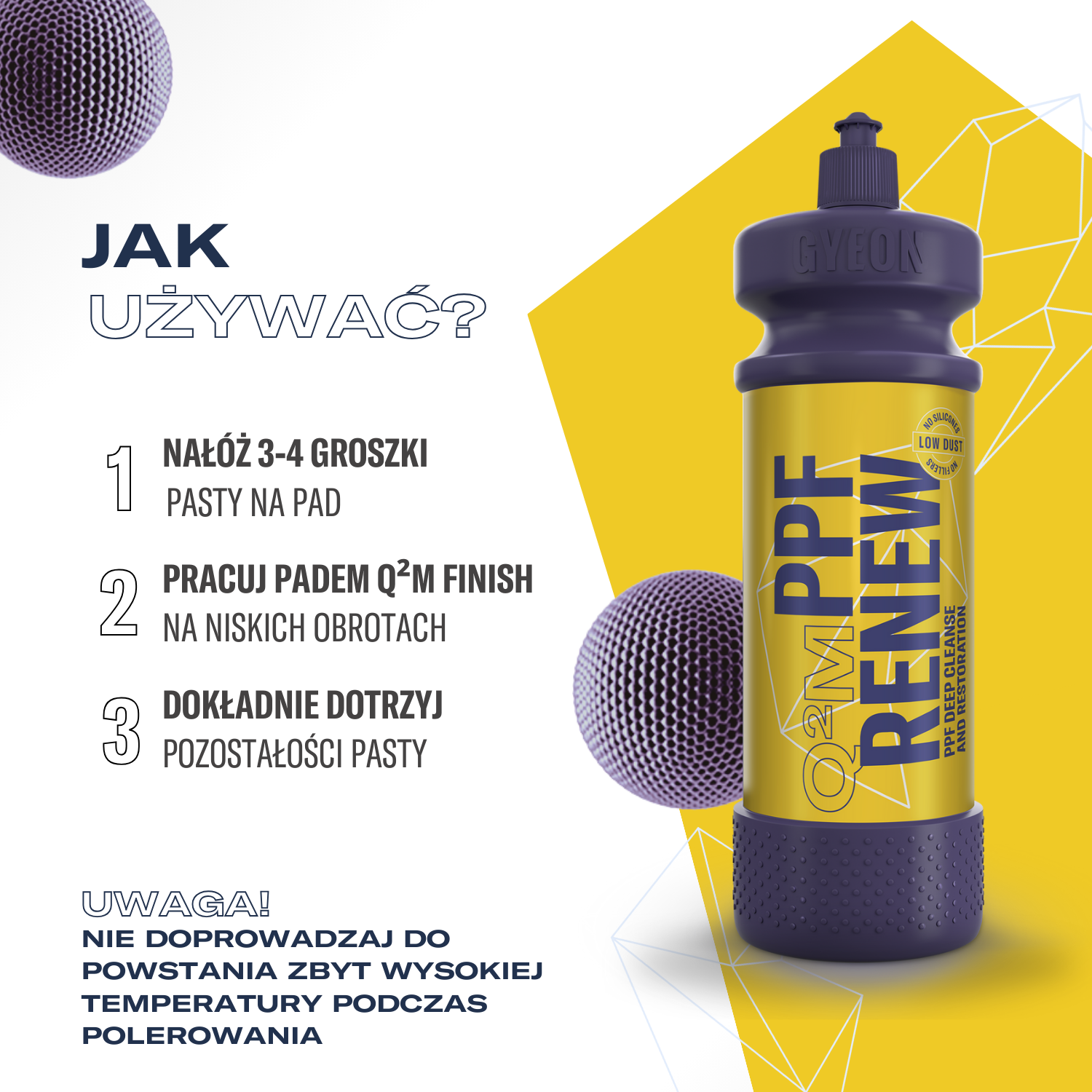Q²M PPF Renew to pierwszy na świecie produkt do pielęgnacji folii ochronnych wzbogacony o SiO². Zawartość krzemu nie tylko pomaga przywrócić połysk i śliskość, ale dostarcza też ochrony przed UV i chemikaliami. Stanowi również świetną bazę przed aplikacją wybranej powłoki ceramicznej.