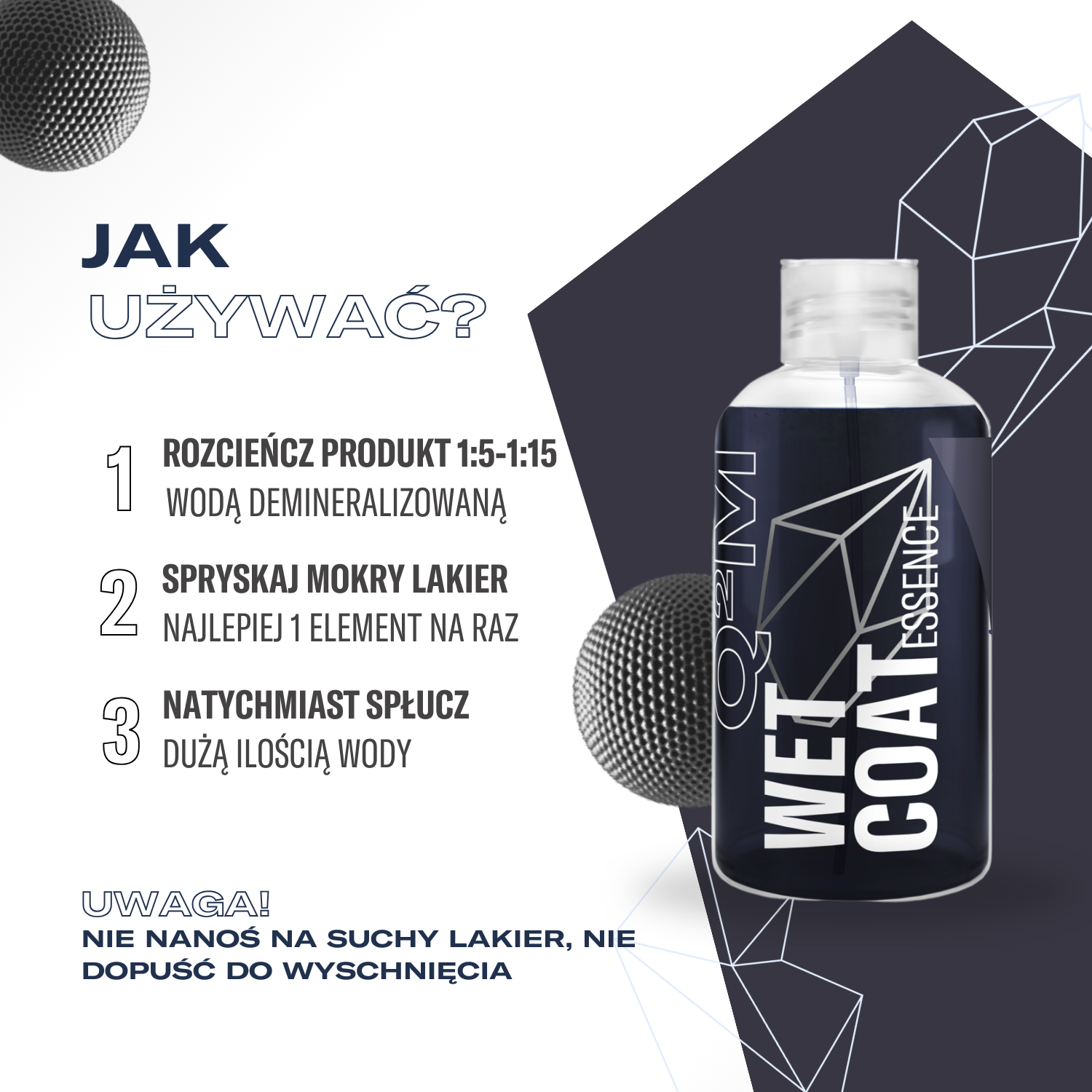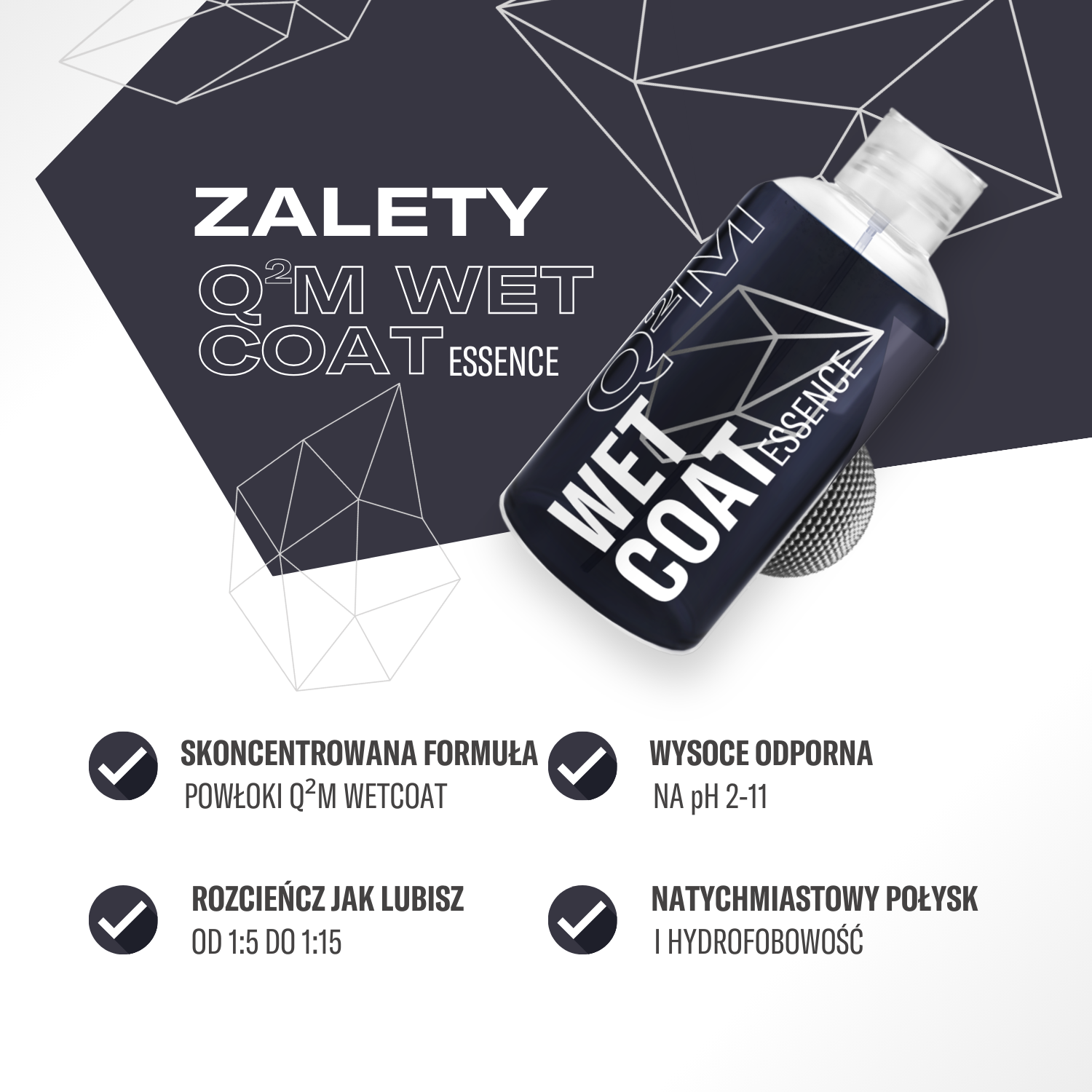 Q²M WetCoat Essence to skoncentrowana wersja naszego super szybkiego wspomagacza hydrofobowości. Jego formuła jest specjalnie zaprojektowana aby zabezpieczyć najlepszy efekt hydrofobowy w jednym kroku. Nie ważne, czy Twoje auto jest zabezpieczone dawno nie odświeżaną powłoką, czy w ogóle nie ma zabezpieczenia - ten produkt zapewni świetne odpychanie wody w moment.NATYCHMIASTOWA HYDROFOBOWOŚĆ W KONCENTRACIE i